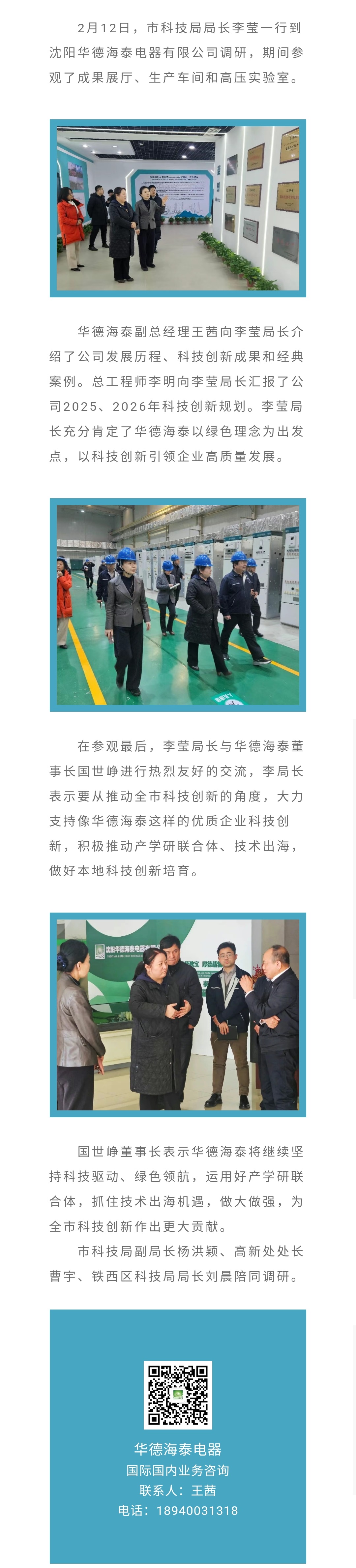 【概要描述】2月12日,市科技局局長李瑩一行到沈陽華德海泰電器有限公司調(diào)研,期間參觀了成果展廳、生產(chǎn)車間和高壓實驗室。
